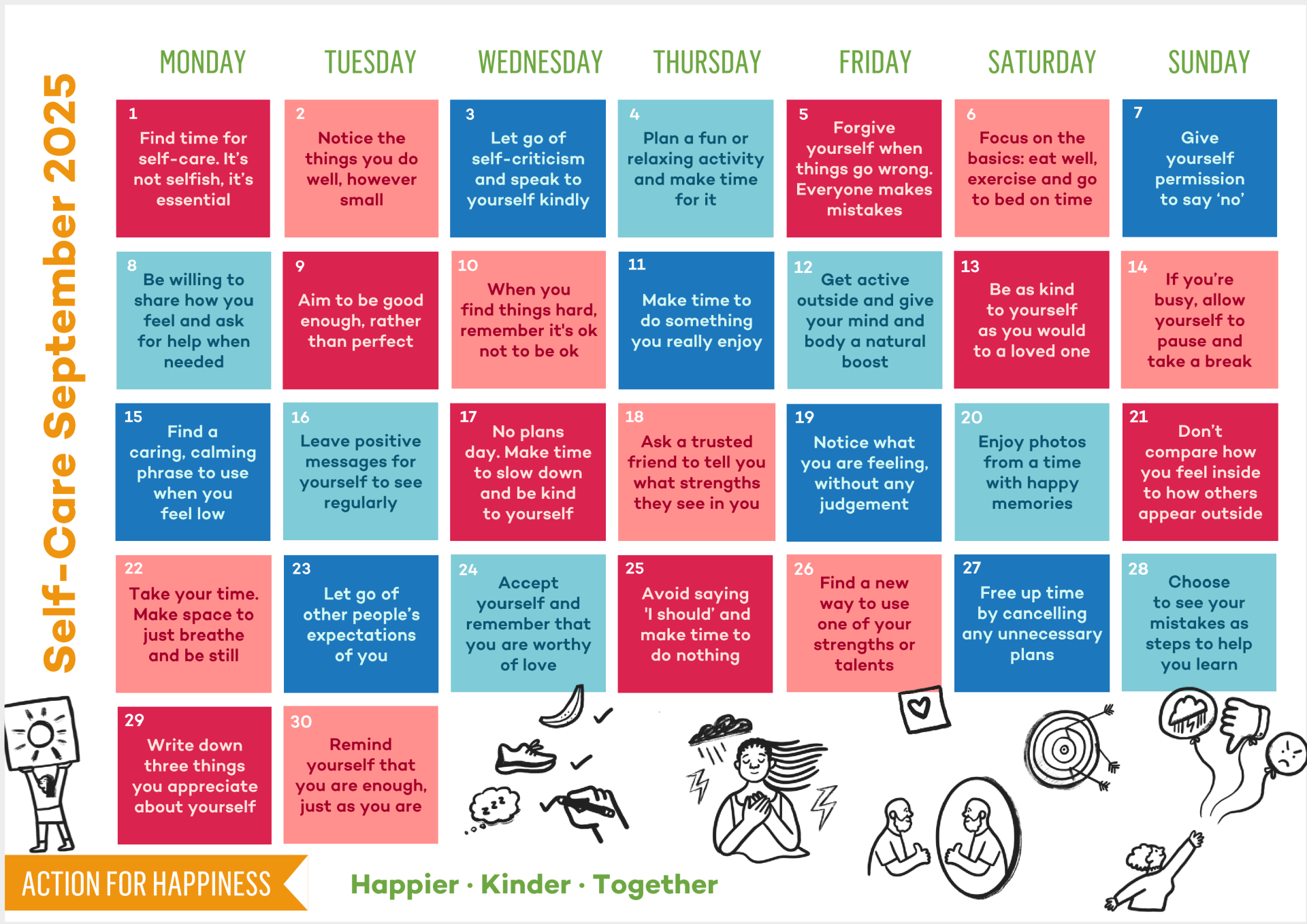 www.actionforhapiness.org provides great resources to support adults and young people to stay mentally healthy one way in which they do this is to publish a well being calendar every month, this provides lots of ideas and activities to keep everyone feeling good.