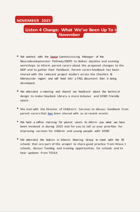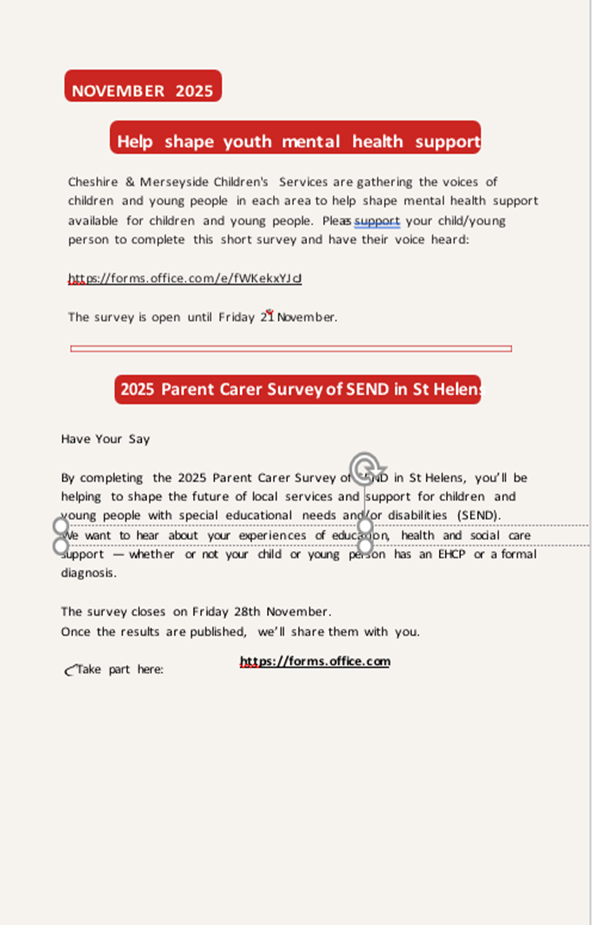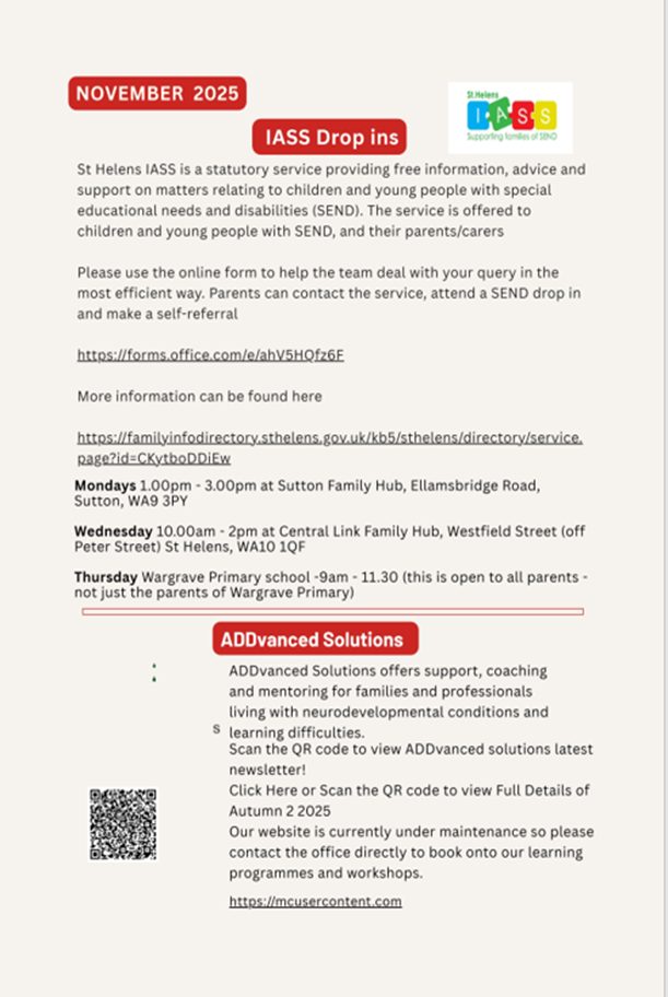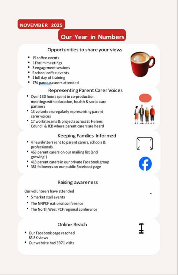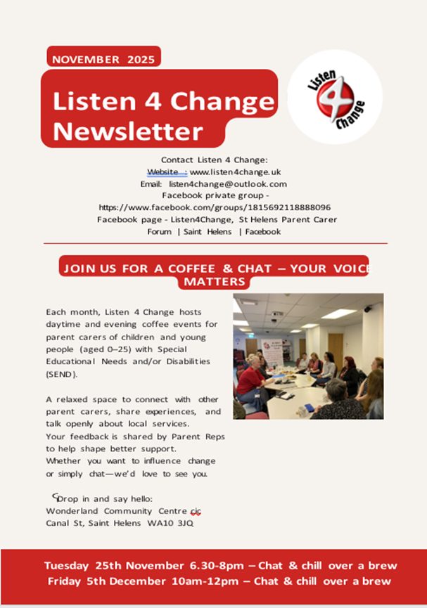 There are also a variety of different drop in sessions for parents and carers to access such as coffee mornings etc that may provide some support for those who would benefit from meeting other SEND parent/carers and focus on different matters.